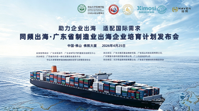 为贯彻落实国家及广东省内外贸一体化发展战略,助力广东制造企业高质量出海、稳健全球化,2026 年 4 月25 日,“同频出海・广东省制造业出海领军企业培育计划” 发布会在制造业重镇佛山隆重举办。现场高朋满座、氛围热烈,来自政府机构、高校协会、制造龙头企业、出海服务平台与实战专家团队的百余位代表齐聚一堂,共话出海新机遇、共商系统赋能新路径。